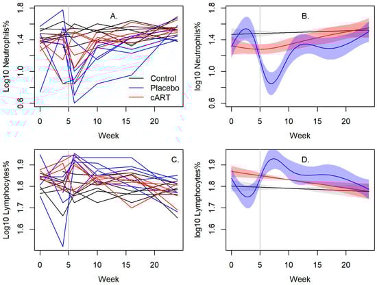 cART reduces myelosuppression of FIV infection. Neutrophil values in FIV+ cats treated with cART normalized by week 16, while placebo-treated FIV+ cats were persistently neutropenic (p < 0.001). Lymphocyte values were normal in all groups but were lower in cART-treated FIV+ cats compared to placebo-treated FIV+ cats. The vertical bar indicates when cART and placebo treatment began. (A,C) Line plots of individual cats over time and (B,D) their associated spline fits from GAM analyses are presented.