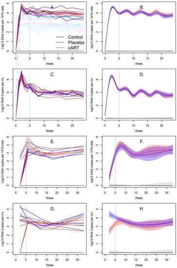 cART reduces salivary viral RNA loads in FIV+ cats. (A–D) Blood FIV viral RNA and proviral DNA loads did not differ between cART-treated FIV+ cats and placebo-treated FIV+ cats. (E–H) Viral RNA loads in the saliva of cART-treated FIV+ cats were lower than placebo-treated FIV+ cats, but they remained similar starting from week 6. The vertical bar indicates when cART and placebo treatment began. (A,C,E,G) Line plots of individual cats over time and (B,D,F,H) their associated spline fits from GAM analyses are presented.