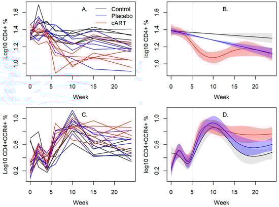 FIV infection induces a primary Th2 immunophenotype. cART significantly lowered CD4+ T cells in the blood of FIV+ cats compared to those treated with a placebo. CD4+CCR4+ cells in cART-treated FIV+ cats were significantly higher than in placebo-treated FIV+ cats, and both were slightly higher than in uninfected control cats. cART may inhibit inflammation and immune activation of FIV infection with an upregulated Th2 immunophenotype. The vertical gray bar indicates when cART and placebo treatment began. (A,C) Line plots of individual cats over time and (B,D) their associated spline fits from GAM analyses are presented.