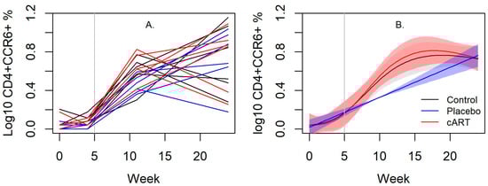 cART improved oral immunity in FIV infected cats. In the mandibular lymph nodes of cART-treated FIV+ cats, CD4+CCR6+ cells were significantly higher than in placebo-treated FIV+ cats. The increase of CCR6+ lymphocytes in cART-treated FIV+ cats may illustrate a partial restoration in Th17 cells. Collectively, the results may demonstrate that cART improves mucosal immunity. The vertical bar indicates when cART and placebo treatment began. (A) A line plot of individual cats over time and (B) its associated spline fit from GAM analyses are presented.