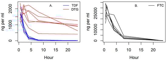 Dolutegravir (A) plasma concentration remained stable for 24 h. (A) Tenofovir (TDF) and (B) emtricitabine (FTC) plasma concentrations quickly declined in cats and remained low by 4 and 8 h after administration, respectively.