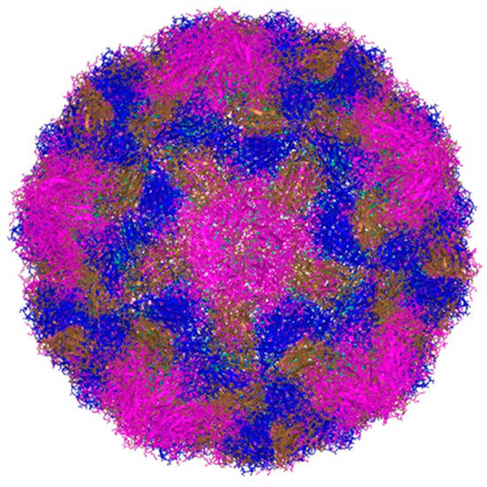 Figure 1. A three-dimensional structure of rhinovirus B14 drug-resistant mutant (original representation; MMDB ID: 225640). Color legend: capsid subunit VP1 (pink), capsid subunit VP2 (brown), capsid subunit VP3 (blue), capsid subunit VP4 (green). Source: National Center for Biotechnology Information (NCBI) Structure Summary MMDB. Representations were made with the use of the iCn3D Structure Viewer using Three.js and jQuery (source code available at https://github.com/ncbi/icn3d, accessed on 21 March 2023).