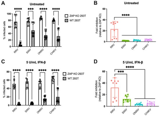 Alphavirus replication shows differential sensitivity to endogenous ZAP in 293T cells. (A,C) ZAP KO and WT 293T cells untreated (A) or treated with 5 U/mL IFN-β for 24 h (C) were infected with GFP-expressing RRV, SINV, ONNV, or CHIKV vaccine strain 181/clone 25 (MOI = 1 PFU/cell). Cells were harvested and fixed at 24 h post-infection (h.p.i.), and their percentage of infection was determined by flow cytometry. Data are combined from three independent experiments performed with biological replicates in triplicate wells. Error bars represent the standard deviations (SD). Asterisks indicate statistically significant differences (unpaired T test with Holm–Šídák’s multiple comparisons test: ***, p < 0.001; ****, p < 0.0001). (B,D) Fold inhibition of alphavirus replication by ZAP. Data from panels A (B) or C (D) are represented. Fold inhibition relative to ZAP KO was calculated by dividing the percentage of infection of each virus in ZAP KO 293T cells by the percentage of infection in WT 293T cells. Error bars represent the standard deviations (SD). Asterisks indicate statistically significant differences (one-way ANOVA and Tukey’s multiple comparisons test: ***, p < 0.001; ****, p < 0.0001).