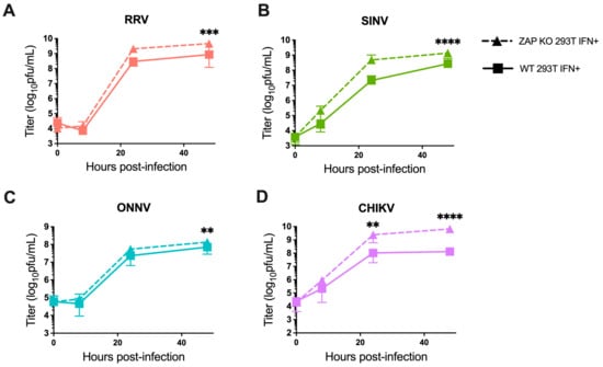Alphavirus production shows differential sensitivity to IFN-induced endogenous ZAP in 293T cells. Following treatment with 5 U/mL IFN-β for 24 h, ZAP KO and WT 293T were infected with RRV (A), SINV (B), ONNV (C), and the CHIKV vaccine strain (181/clone 25) (D) at MOI = 0.1 PFU/cell. Media overlaying the cells were harvested at 0, 8, 24, and 48 h.p.i., and the viral titer was determined by infection of BHK-21 cells in standard plaque assays. Mean values from four biological replicates across two independent experiments are plotted, and error bars represent the SD. Asterisks indicate statistically significant differences (two-way ANOVA and Bonferroni posttest: **, p < 0.01; ***, p < 0.001; ****, p < 0.0001).