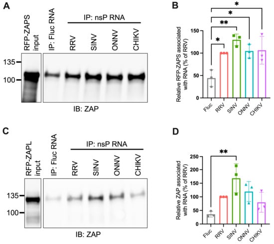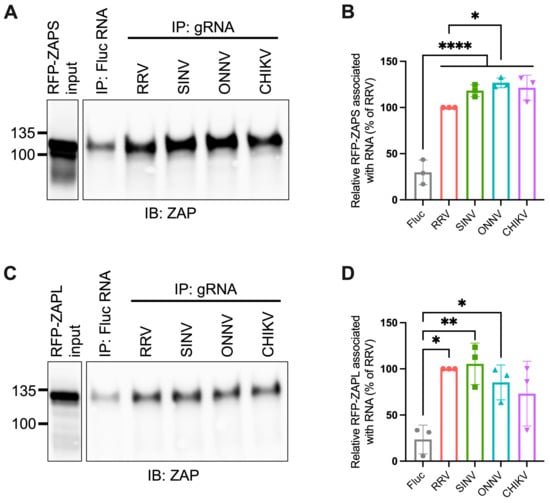 Given the importance of ZAP’s ability to bind viral RNA in its inhibition of virus replication, we hypothesized that ZAP-resistant alphaviruses may be able to evade ZAP recognition. Thus, we anticipated there would be greater ZAP binding to the RNA of alphaviruses that are more sensitive to ZAP inhibition (RRV, SINV) than to the RNA of those more resistant (ONNV, CHIKV). To evaluate this hypothesis, we performed in vitro RNA pull-down assays in which we incubated lysates of ZAP KO 293T cells with induced expression of RFP-tagged ZAPS or ZAPL with biotinylated genomic RNA (gRNA) of RRV, SINV, ONNV, or CHIKV. We then immunoprecipitated the biotinylated RNA using streptavidin beads and probed for the presence of bound RFP-ZAPS or -ZAPL. As a control for ZAP background binding, we also assayed ZAP binding to biotinylated firefly luciferase (Fluc) RNA. The resultant ZAP immunoblots were quantified by ImageJ, and the intensity of each RNA-associated ZAP band was normalized to RRV gRNA-associated ZAP to account for variation in overall signal intensity across three independent experiments. In general, in comparison to ZAPS, less ZAPL is pulled down with all RNA, most likely a consequence of comparably lower ZAPL expression in the whole cell lysate input (Figure 3A,C). For ZAPS, we found a significant increase in binding to the gRNA of all tested alphaviruses when compared to the Fluc RNA control (Figure 3B). We also observed a slight increase in ZAPS binding to ONNV gRNA compared to RRV gRNA, contrary to the phenotype of RRV being more ZAP-sensitive than ONNV (Figure 3B). We found a significant increase in ZAPL binding to RRV, SINV, and ONNV gRNA compared to the Fluc control, but not for CHIKV gRNA, likely due to variability across experiments (Figure 3D). Otherwise, as with ZAPS, we found no significant differences in ZAPL binding to alphavirus gRNA (Figure 3D). These data do not support a correlation between the ability of ZAP to inhibit alphavirus replication and the level of ZAP binding to the viral gRNA.