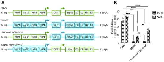 The lack of correlation between alphavirus ZAP sensitivity and ZAP binding to alphavirus gRNA motivated us to narrow down the alphavirus genome region that confers sensitivity or resistance to ZAP. To this end, we generated chimeric viruses in which we swapped the nsP and sP gene regions of a ZAP-sensitive virus, SINV, and a ZAP-resistant virus, ONNV (Figure 4A). These viruses were chosen because they contain restriction sites that facilitate the ready generation of the chimeric viruses. Additionally, we chose to assay the sensitivity of the chimeric viruses to ZAPS and ZAPL in our ZAP-inducible 293T cell lines, where SINV is significantly more sensitive to ZAP than ONNV [25]. While we were able to generate viable virions of both chimeric viruses from BHK-21 cells, which are defective in IFN production, the SINV nsP/ONNV sP chimeric virus was unable to replicate even in the absence of ZAP in ZAP KO 293T cells, likely due to a more robust IFN response in 293T compared to BHK-21 cells. When we assayed the sensitivity of the ONNV nsP/SINV sP chimeric virus to ZAPS and ZAPL inhibition in the ZAP-inducible ZAP KO 293T cells, we found that its ZAP sensitivity more closely resembles that of ONNV (Figure 4B), demonstrating that the nsP gene region is likely responsible for conferring ZAP sensitivity on an alphavirus.