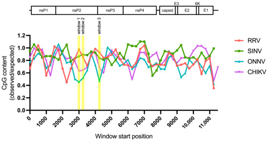 Sliding window analysis of alphavirus CpG content was performed using a custom Python script (https://github.com/nguyelea/alphavirus_zap_sensitivity_paper/blob/main/cg_sliding_window.py, accessed on 22 December 2022). In brief, the CpG observed/expected ratio was calculated by dividing the observed frequency of CpG dinucleotides within a window by the product of the frequencies of observed C and G mononucleotides within the same window. This calculation was performed on 500-bp sliding windows with a step size of 250-bp. The analysis was performed on the genomes of the wild-type alphavirus strains described in Section 2.2 above. Windows were aligned by Clustal Omega with default parameters [46].