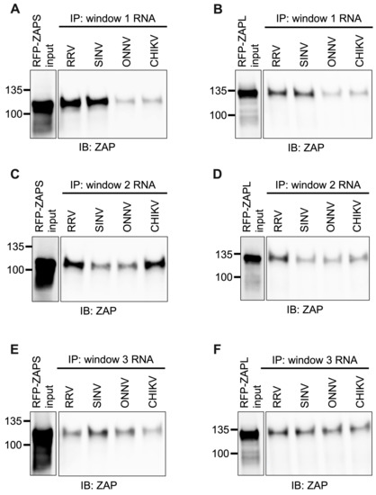 ZAPS and ZAPL binding to one but not all CpG-correlated windows correlates with alphavirus replication sensitivity to ZAP. Lysates of ZAP KO 293T cells with induced expression of RFP-ZAPS (A,C,E) or RFP-ZAPL (B,D,F) were incubated with biotinylated RRV, SINV, ONNV, or CHIKV CpG-correlated window 1 (A,B), window 2 (C,D), or window 3 (E,F) RNA. Following streptavidin-mediated pull-down of biotinylated RNA, ZAP associated with each RNA and in whole cell lysate (input) was assayed by immunoblot. Expected sizes: RFP-ZAPS = 106 kDa, RFP-ZAPL = 130 kDa. Data are representative of results from three independent experiments for window 1 and two independent experiments for windows 2 and 3.