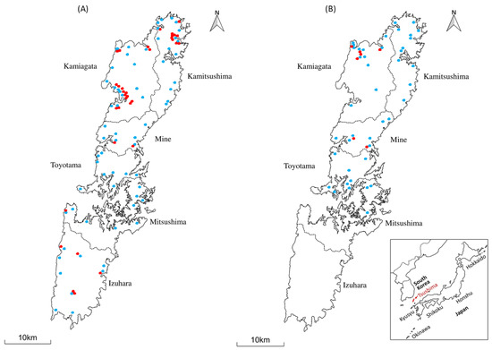 Maps of Tsushima Island and sample collection sites. (A) Map of sample collection sites for domestic cats. (B) Map of sample collection sites for wild cats. Blue dots indicate sample locations. Red dots represent positive samples.