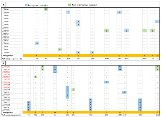 In total, 35 FFV-positive samples (7 TLCs and 28 domestic cats) were sequenced; however, two domestic cat samples were lost. Nucleotide sequences of the partial env gene (SU region) were determined. Two distinct env genotypes (F17/951-Type and FUV-Type) were identified with a nucleotide similarity ranging from 98 to 100% and 82 to 85% within and between genotypes, respectively (Figure 2). A total of 12 mutations (5 non-synonymous and 7 synonymous) were identified in 15 samples (F17/951-Type) (Figure 2A), and 12 (4 non-synonymous and 8 synonymous) in 18 samples (FUV-Type) (Figure 2B). The FUV and F17/951 types are distributed along the Tsushima Island (Figure S1). The nucleotide differences may appear as a logical result because the amplification target in this study was the SU region, which is considered a hypervariable region.