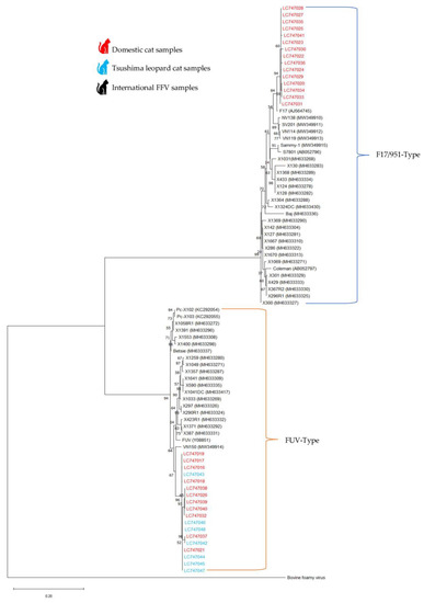 A total of 33 FFV sequences and 51 international FFV sequences retrieved from the GenBank database were used to construct a phylogenetic tree based on nucleic acids (Figure 3). Phylogenetic analysis demonstrated that 15 FFV-positive domestic cat samples belonged to the F17-Type and 18 samples (11 domestic cat and 7 TLC samples) belonged to the FUV-Type. Evidence of FFV transmission on Tsushima Island is strong, although some subclades indicate region-specific viral populations. FFV isolates from domestic cats were interspersed throughout the tree; in contrast, TLC FFV isolates were confined to one clade.