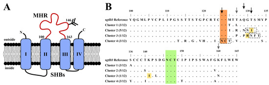 Since 1982, a recombinant vaccine consisting of yeast-expressed SHBs has been available and leads to excellent seroprotection rates of up to 99% in certain cohorts, e.g., in young women [19]. Even though the vaccine has proven to be highly effective, breakthrough infections and reactivation of immune escape variants are regularly described [20,21,22]. Vaccine- and passive immunoprophylaxis-associated escape mutations are often located between aa137 and 147, with G145R being most frequently reported [8,23]. While single amino acid substitutions in the S protein (such as K141E and G145R) can be sufficient to escape neutralizing antibodies against SHBs (anti-HBs), they often concomitantly cause a decrease in virion secretion efficiency [10,24,25]. Furthermore, substitutions and insertions that lead to novel N-linked glycosylation motifs (sequons; N-X-S/T) have been frequently reported [26,27]. The functionality of these sequons as N-glycosylation targets depends on their positions in the protein, neighboring residues, and secondary/tertiary structure. For the MHR within SHBs, sequon insertions/substitutions are most frequently observed between aa112 and 117 and between aa129 and 131 [27,28,29]. Glycosylation mutants may emerge individually or in combination with immune escape mutations [9,24,26,27,30,31,32] where they have been shown to alleviate the secretion deficit phenotype [10,24,26,27]. Of clinical concern, the N-glycosylation variants Q129N and T131N [26] as well as immune escape mutations such as D144E and G145R [33,34,35] have been shown to be transmissible horizontally.