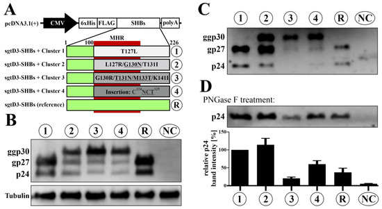 Ectopic sequons of the variant SHBs serve as N-glycosylation acceptor sites and cause hyperglycosylation of SHBs. (A) Construction of SHBs expression plasmids. Expression of N-terminally 6xHis- and FLAG-tagged SHBs is controlled by the CMV immediate/early promoter present in pcDNA3.1(+). The sequence encoding amino acids 100–226 (encompassing the MHR (aa100-163)) of the reference subgenotype (sgt) D3 strain was exchanged with the corresponding sequences of the viral variants. Mutations causing additional glycosylation are underlined. Representative Western blot of (B) intracellular and (C) extracellular SHBs expression pattern. HepG2 cells were transiently transfected with 6xHis-FLAG-SHBs-expression plasmids. Four days post-transfection, supernatants were collected and cells were lysed. Cell lysates/supernatants were subjected to SDS-PAGE and blotted. Membranes were probed with an anti-FLAG antibody to visualize SHBs. (D) SHBs in the supernatants was treated with PNGase F and subjected to Western blot as described above. Bands of deglycosylated SHBs of three independent experiments were quantified with Image Studio Lite. MHR = major hydrophilic region; NC = negative control (empty pcDNA3.1(+) was transfected); R = reference strain of sgtD3.