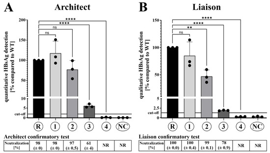 Detectability of SHBs is severely impaired by the combination of hyperglycosylation and immune escape variants. (A) Top panel: HepG2 cells were transiently transfected with SHBs-expressing plasmids and supernatants were collected four days after transfection. SHBs in the supernatants was adjusted to equal amounts (as quantified by immunoblot) and measured in the quantitative HBsAg assay (Abbott ARCHITECT). Bottom panel: supernatants containing equal amounts of SHBs (as quantified by immunoblot) were tested in the HBsAg confirmatory test (Abbott ARCHITECT). (B) Top panel: supernatants containing equal amounts of SHBs (as quantified by immunoblot) were measured in the qualitative HBsAg assay (DiaSorin Liaison). Bottom panel: supernatants containing equal amounts of SHBs (as quantified by immunoblot) were tested in the HBsAg confirmatory test (DiaSorin Liaison). All panels show the results of three independent experiments. R = SHBs of subgenotype D3 reference strain; 1/2/3/4 = SHBs containing aa1-99 of the reference strain and aa100-226 of a patient-derived sequence of cluster 1/2/3/4, respectively (also refer to Figure 2A). NC = negative control (supernatant of empty pcDNA3.1(+)-transfected cells). NR = nonreactive. ns = not significant, ** = p < 0.01, **** = p < 0.0001 (unpaired t-test).