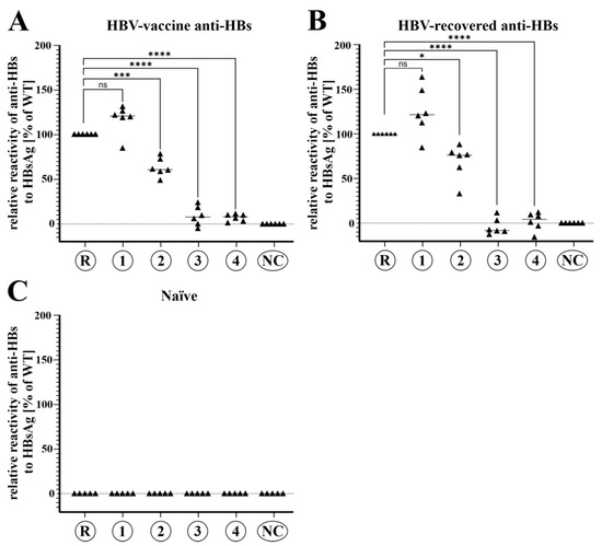 Hyperglycosylation of variant HBsAg masks epitopes recognized by anti-HBs which was induced in six human donors each by vaccination or HBV infection. SHBs within cell culture supernatants was diluted to equal amounts (corresponding to 10 IU/mL WT HBsAg) and preincubated with human anti-HBs-positive sera, containing 50 IU/L anti-HBs. After incubation, quantitative unbound anti-HBs levels were measured with the ARCHITECT anti-HBs-test (Abbott ARCHITECT). Data are shown as relative reactivity of vaccinee (A), convalescent (B), and naïve (C) human sera with variant HBsAg. Original data used for calculation of relative reactivities are presented in Table S1. R = SHBs of subgenotype D3 reference strain; 1/2/3/4 = SHBs containing aa1-99 of the reference strain and aa100-226 of the patient-derived sequences of cluster 1/2/3/4, respectively (also refer to Figure 2A). NC = negative control (supernatant of empty pcDNA3.1(+)-transfected cells). ns = not significant, * = p < 0.05, *** = p < 0.001, **** = p < 0.0001 (unpaired t-test).