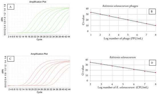 To date, the time course of phage–host dynamics in liquid medium is most frequently monitored based on optical density measurements of the loss of turbidity from an initial bacterial host suspension due to the lytic activity of a phage or a mixture of phages. To link these optical density data to quantification of host and phage populations, parallel counting on solid medium is usually performed by both direct plating and a standard double-layer plating, respectively, for the host bacterium and the phage or phages, at each sampling time [29,30,31,32]. This is laborious and time-consuming, and the efficiency mainly depends on several factors, such as the type of plaque, the target bacterium, and the culture medium [31]. Some other inconveniences consist of the difficulty to quantify bacterial hosts and phages in very short periods, especially when different experimental conditions are running simultaneously, and the inability to quantitatively differentiate each phage in a mixture, as well as host and phages in non-sterile conditions, such as environmental water, soil suspensions, or plant extracts. In contrast, real-time quantitative PCR (qPCR) has proven to be an accurate, reproducible, rapid, simple, and useful alternative, allowing for individual quantification of multiple bacteria and phages in mixed cultures [31,32,33,34]. With respect to R. solanacearum, several real-time qPCR protocols have been described [35,36,37,38,39,40,41]. However, no real-time qPCR protocol has been developed so far for phages with specific lytic activity against R. solanacearum. In this regard, in the present work, specific primers and TaqMan probes have been designed to develop two real-time qPCR protocols: a duplex qPCR for the simultaneous detection and quantification of the three patented R. solanacearum phages, vRsoP-WF2, vRsoP-WM2, and vRsoP-WR2, and the target bacterium, and a multiplex qPCR for detection of the three phages, the individual vRsoP-WR2 phage, and the target bacterium. Additionally, the multiplex real-time qPCR protocol has been validated for the detection and quantification of the three R. solanacearum phages and the target bacterium in water, soil, and plant material, mimicking samples taken under field conditions.