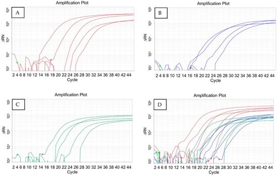 Real-time multiplex PCR. Amplification curves of serial dilutions from 106 to 102 PFU/mL of vRsoP-WF2, vRsoP-WM2, and vRsoP-WR2 phages ((A)—red), amplification curves of serial dilutions from 106 to 103 CFU/mL of Ralstonia solanacearum ((B)—blue), amplification curves of serial dilutions from 106 to 103 CFU/mL of vRsoP-WR2 phage ((C)—green), and amplification curves of serial dilutions from 106 to 102 CFU/mL of vRsoP-WF2, vRsoP-WM2, and vRsoP-WR2 phages, and from 106 to 103 CFU/mL of bacteria ((D)—red + green + blue). Dilutions of phages and the bacterium were performed in river water and direct sample preparation was used. Amplifications were performed in triplicate.