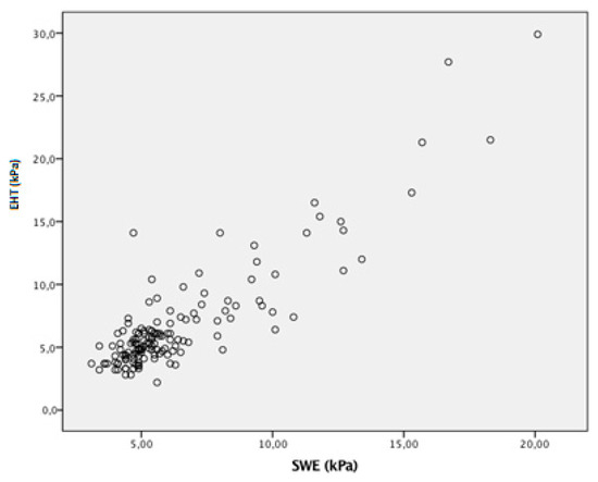Scatter plot of distribution of transient elastography (TE) vs. 2D-shear wave elastography (2D-SWE).