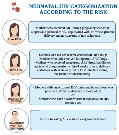 “Neonatal HIV Categorization According to the Risk”. Adapted from Recommendations for the Use of Antiretroviral Drugs During Pregnancy and Interventions to Reduce HIV Transmission in the United States. 30 December 2021. Created in BioRender.com.