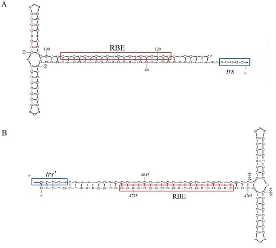 Inverted terminal repeats of the 5′ (A) and 3′ (B) termini of Sp_PsDPV. The Rep Binding Element (RBE) and the Terminal Resolution Site (trs) are enclosed in boxes.