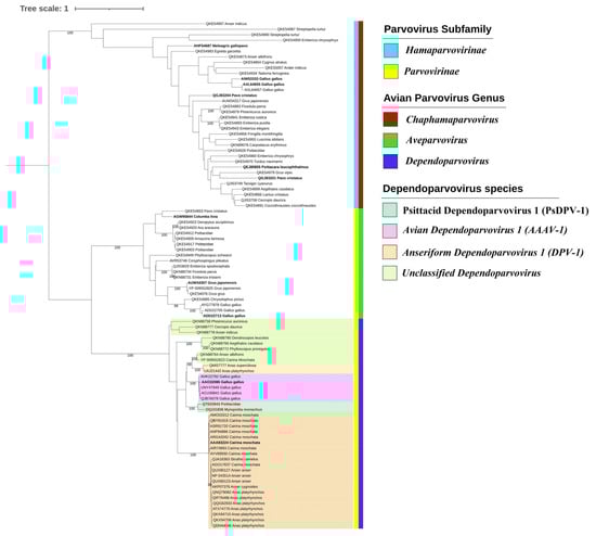 Maximum-likelihood phylogenetic inference of 92 Rep protein sequences of avian parvoviruses. The tree was inferred under a Q.pfam+R+F amino acid substitution model with nodal support values based on 1000 bootstrap replicates. The color code for the subfamilies, genera, and species used in the vertical bars to the right of the names of the species in the tree is indicated in the legend on the right. Representative sequences of avian parvovirus species are highlighted in bold, and the dependoparvoviruses from Psittacidae are highlighted in red. Only the support values above 98 are displayed.