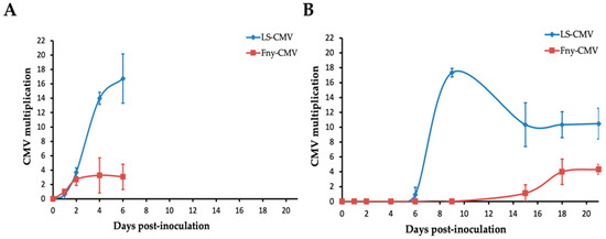 Time course of CMV multiplication in Co-1. CMV multiplication is estimated from the accumulation of viral RNA (mg/g fresh weight) of (A) inoculated rosette leaves and (B) systemically infected rosette leaves. Data for LS-CMV are represented as blue diamonds and data for Fny-CMV are represented as red squares. Data are mean ± standard error of three replicates per time point and virus.
