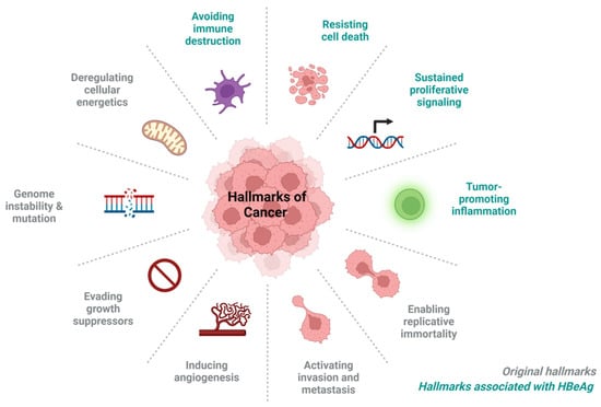 The HBeAg-associated hallmarks of cancer, depicted in blue in Figure 1, will be discussed.