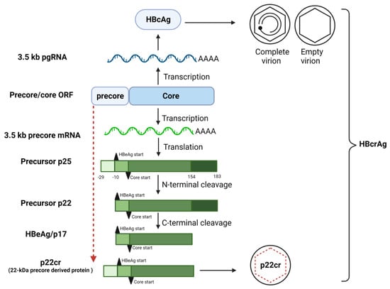 HBeAg can form part of a collection of three species of proteins known as HB core related antigen (HBcrAg), which consists of related proteins sharing an identical 149 amino acid sequence: HBcAg, HBeAg, and a truncated 22 kDa precore protein (p22Cr). Like HBeAg, p22cr is also a processed product of the precore protein, but with protein processing only occurring at the C-terminal and not the amino end [50] (Figure 2). Recent studies have shown that the detection of HBcrAg levels is a useful marker for disease monitoring, predicting treatment response and disease outcome in chronic hepatitis B (CHB), and can also predict the risk of HCC [28,51,52].