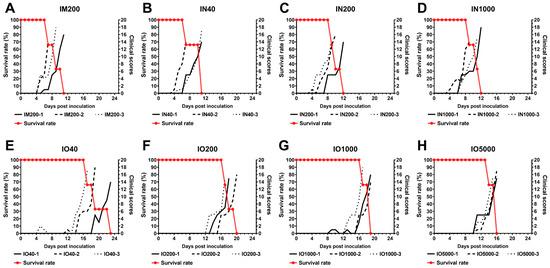 Survival rates and clinical scores in each group. (A) Inoculation of ASFV SY18 at 200 TCID50 via the IM route; (B–D) Inoculation of ASFV SY18 at 40, 200, and 10,000 TCID50 via the IN route; (E–H) Inoculation of ASFV SY18 at 40, 200, 1000, and 5000 TCID50 via the IO route. The line indicating the clinical score for each pig is shown on the right Y-axis. The line indicating the group’s survival rate is on the left Y-axis.