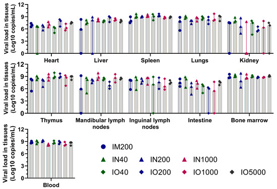Viral load in tissues and blood. ASFV viral load in tissues (heart, liver, spleen, lungs, kidneys, thymus, mandibular lymph nodes, inguinal lymph nodes, intestines, bone marrow) and blood from pigs in the IM group (IM200), IN group (IN40, IN200, IN1000), and IO groups (IO40, IO200, IO1000 and IO5000).