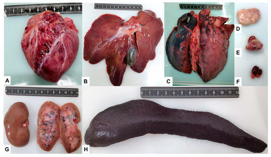 Gross lesions at autopsy. (A) Heart with myocardial haemorrhage from pig No. IN200-2; (B) Enlarged and hardened liver from pig No. IM200-1; (C) Necrotic lung from pig No. IO40-3; (D–F) Enlarged and necrotic inguinal lymph nodes, submandibular lymph nodes, and thymus from pig No. IO5000-1; (G) Kidney with bleeding spots from pig No. IM200-2; (H) Severely enlarged spleen from pig No. IO200-2.