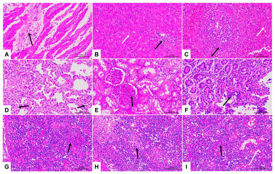 Histopathological section (H and E staining, 400×) (A) Heart from pig No. IM200-2, fibrous tissue hyperplasia visible in areas (black arrow) of the myocardial interstitium; (B) Liver from pig No. IN40-2, congested and enlarged hepatic sinusoids (white arrows) with inflammatory cell infiltration (black arrows); (C) Spleen from pig No. IO200-2, atrophy of splenic nodules, massive cell necrosis, broken nuclei (black arrows), and reduced lymphocytes (white arrows); (D) Lung from pig No. IO40-3, partial alveolar atrophy with inflammatory cell infiltration (black arrow) and cells with fragmented nuclei (black arrow); (E) A kidney from pig No. IO100-2, tubular epithelial cells with oedema, loose vacuolation of the cytoplasm and dilated lumen (white arrow), glomerular amyloidosis, thickened basement membrane, and poorly defined capillary collaterals (black arrow); (F) Intestine from pig No. IM200-1, epithelial cells of the mucosal layer are eroded and detached, the lamina propria is exposed, and limited infiltration of inflammatory cells is visible (black arrow); (G) Thymus from pig No. IO200-3, necrotic degeneration of cells with fragmented nuclei (black arrow); (H) Inguinal lymph node from pig No. IO1000-2, with necrotic degeneration of lymphocytes, and fragmentation of nuclei (black arrow); (I) Submandibular lymph node from pig No. IO200-3, necrotic degeneration of lymphocytes with fragmented nuclei (black arrow), and extensive vasodilation and congestion (white arrow).
