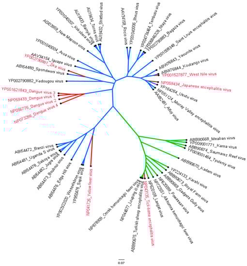 Bayesian evolutionary analysis sampling tree cladogram of the mosquito- (blue) and tick- (green) borne flavivirus-infecting vertebrates. The tree was constructed using the Bayesian Markov chain Monte Carlo method available in MrBayes v.3.2.3 [3]. The six medically relevant viruses, DENV (serotype 1–4), ZIKV, WNV, YFV, JEV and TBEV, have been highlighted in red.