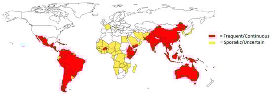 Countries at risk for DENV infections. Countries labeled Frequent/Continuous are currently experiencing DENV outbreaks or ongoing DENV transmission, while Sporadic/Uncertain suggests a varying and unpredictable risk and the unavailability of country-wide data [11]. Map created using QGIS software (small countries not included).