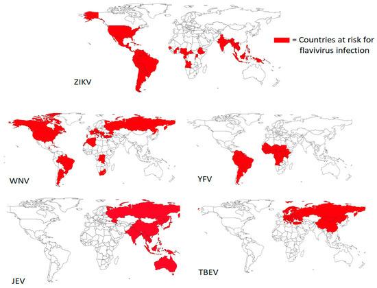 The global distribution and countries at risk for flavivirus infections. ZIKV is found throughout the sub-tropical and tropical regions of the Americas, Africa and Asia [9]. The risk for WNV infection is localized in Europe, parts of Africa and the Americas [12,13], whereas the risk for YFV is only found in South America and Africa [14]. Ongoing transmission of JEV occurs in Asia and Oceania [15,16], and TBEV is distributed throughout Europe and northeast Asia [17,18]. Map created using QGIS software (small countries not included).