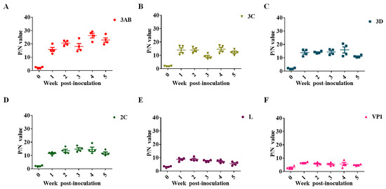 Dynamic analysis of antibodies encoding different viral proteins in SVA-infected swine. (A) Antibody kinetics against the SVA 3AB protein. (B) Antibody kinetics against the SVA 3C protein. (C) Antibody kinetics against the SVA 3D protein. (D) Antibody kinetics against the SVA 2C protein. (E) Antibody kinetics against the SVA L protein. (F) Antibody kinetics against the SVA VP1 protein. P/N value, the ratio of positive control to a negative control.