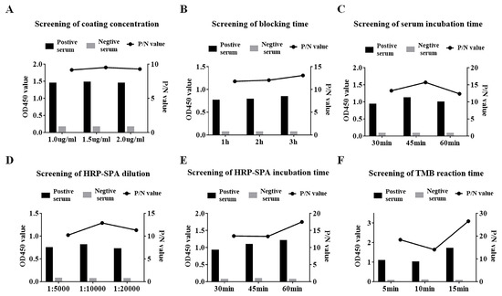 Optimization of ELISA reaction conditions. (A) Screening of coated antigen concentration. (B) Screening of blocking time. (C) Screening of serum incubation time. (D) Screening of HRP-SPA dilution. (E) Screening of HRP-SPA incubation time. (F) Screening of TMB reaction time. The left axis shows the absorbance of the data (OD450) and the right axis shows the ratio of the positive control to the negative control (P/N value).
