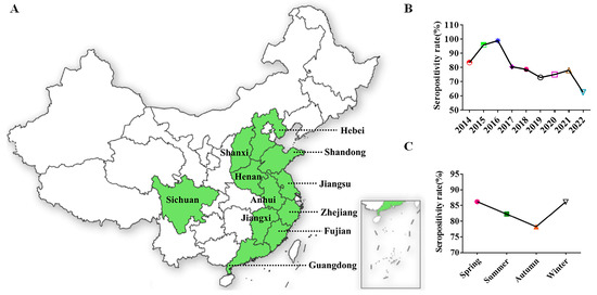 Given the high sensitivity and specificity of 3AB ELISA, a nine-year (2014–2022) retrospective and prospective serological study was conducted to determine the epidemiological profile and dynamics of SVA in East China. A total of 3930 serum samples used for SVA surveillance were collected from 158 pig farms (69/158, information integrity). The area of light green in the map represented the sampled provinces (Figure 4A). Overall, the seroprevalence (82.19%) of SVA was generally higher in East China. The year 2016 was considered to be a turning point in the epidemiology of SVA in China, which is consistent with previous reports [32]. In subsequent years, the seropositivity rate showed a downward trend (Figure 4B). The possible reasons for this difference were the evolution of the strain. The SVA strains isolated before 2016 and the strains isolated in Canada and Brazil showed high homology, whereas the strains isolated after 2016 were all more closely related to the US strain. Additionally, in terms of the seasonal distribution of the disease, the serum positive rate was lower in autumn than in other seasons (Figure 4C).