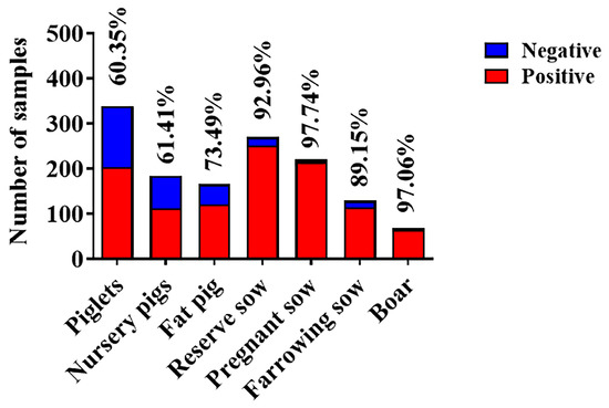 To further observe the prevalence of SVA in China, the seroprevalence of 3930 samples from 11 cities was analyzed. In recent years, the serum prevalence of SVA showed a significant downward trend (Figure 4B). In terms of the seasonal distribution, the prevalence rate in autumn was slightly lower (Figure 4C). There was no significant difference in the overall positive rate among different provinces in East China (Table 3). However, the seroprevalence for Jiangsu (75.0%) and Zhejiang (81.6%) provinces was still high, while for Shandong and Jiangxi provinces, it was lower than 40% in 2022 (Table 4). In 2022, the prevalence of SVA varied greatly regionally, possibly due to differences in biosafety awareness among breeders. The specific reason remains unknown and awaits further investigation. Since vesicles and erosions associated with SVA infection were seen mainly in sows and fattening (finisher) pigs [9], our study also calculated the seroprevalence of pigs at different growth stages. The antibody-positive rate of piglets and nursery pigs was relatively low at about 60% (Figure 5). We hypothesized that the maternal antibodies acquired by the piglets from the sows further protected them from SVA infection. It was regrettable that the seroprevalence of fat pigs, reserve sows, pregnant sows, farrowing sows and boar was higher.