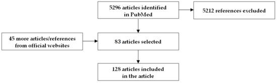 We screened the abstracts of all 5296 articles identified through this first round of searching and selected 83 articles based on our inclusion/exclusion criteria. Information from 45 additional articles and official public health websites was also used. Overall, 128 articles were included in the review (Figure 1).