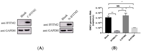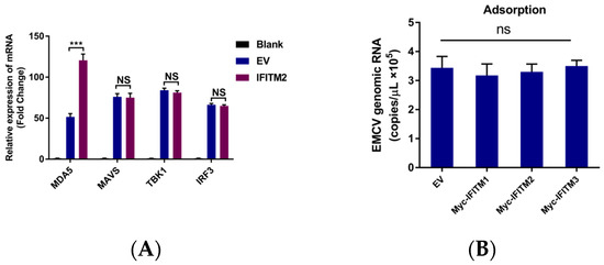 Figure 5A showed that overexpression of IFITM enhances the gene transcription levels of MDA5. Here, we further investigated the effect of the overexpression of IFITM2 on the protein expression levels of these factors during EMCV infection. As shown in Figure 5F,G, the protein expression levels of MDA5 have significantly enhanced in IFITM2 overexpressing cells. Therefore, we suspect that in addition to directly inhibiting the entry of the virus, IFITM2 also enhances its antiviral effect by enhancing IFN-β expression.