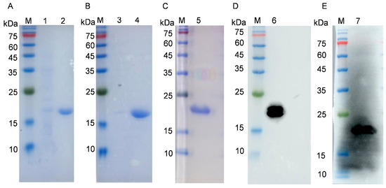 The pET30a(+)-p54 recombinant expression plasmid was constructed by the insertion of the p54 gene truncated in 53 N-terminal codons in the pET30a vector. Gel electrophoresis after double digestion with NdeI and HindIII showed a target band of approximately 400 bp, which was consistent with expectations. Sequencing results further confirmed that the insert comprised the p54 gene. The production of the p54 protein in E. coli was induced and analyzed using SDS-PAGE, which showed the induction of a major species of approximately 19 kDa, which was absent in uninduced samples. The p54 protein was mainly expressed in the supernatant fraction (Figure 1A,B). The His-tagged protein was purified via Ni-affinity chromatography. SDS-PAGE and Western blot showed that the recombinant p54 protein was present as a single species with a purity of approximately 95% (Figure 1C).