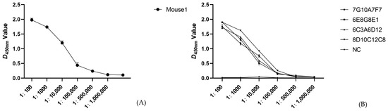 The potency of the mouse serum p54 protein antibody was determined using ELISA to be 1:500,000 after two weeks of triple immunization, as described in Materials and Methods (Figure 2A). Each well included two replicate wells. Single-cell suspensions were prepared from mouse spleens three days after superimmunization and were fused to myeloma SP2/0 cells. The fused cells grew for 9–12 days to form a clonal population of cells, and screening for p54 mAbs was performed using indirect ELISA. Positive samples were subcloned using the limited dilution method, and four hybridoma cell lines capable of stably secreting p54 protein-specific mAbs were obtained after three subcloning procedures (7G10A7F7, 6E8G8E1, 6C3A6D12, and 8D10C12C8). ELISA assays were performed to determine the potency of the four selected monoclonal antibodies, and the results showed that the potency of each mAb was 1:500,000 with two replicates per well (Figure 2B).