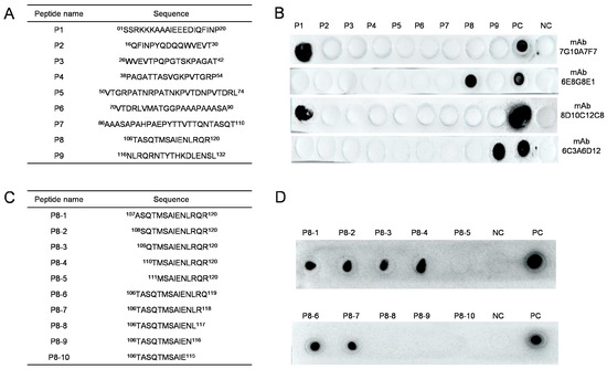 Identification of the epitopes recognized by mAbs 7G10A7F7, 6E8G8E1, 6C3A6D12, and 8D10C12C8: (A) nine synthetic overlapping peptides that span the P54 protein; (B) dot blot analysis of mAbs against the nine peptides; (C) ten shorter overlapping peptides that span peptide 8 (106-TASQTMSAIENLRQR-120); (D) dot blot analysis of mAb against the ten shorter peptides derived from peptide 8. PBS and purified p54 protein were used as negative and positive controls, respectively.