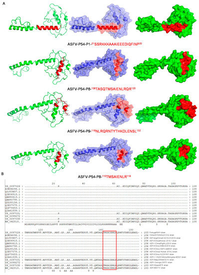 Bioinformatic analysis of p54 epitopes. Epitope 110-TMSAIENLR-118 was subjected to multiple sequence alignment with p54 from other ASFV strains and the spatial structure of the epitopes was screened: (A) epitopes P1 (01-SSRKKKAAAIEEEDIQFINP-20), P8 (106-TASQTMSAIENLRQR-120) (red), and P9 (116-NLRQRNTYTHKDLENSL-132) (red) are shown on the p54 protein; (B) the new p54 epitope 110-TMSAIENLR-118 (red) is displayed on P54.