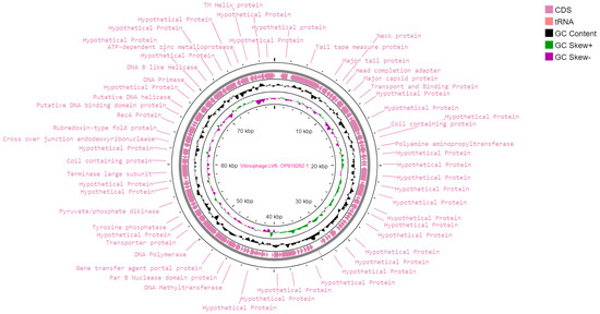 - Srisangthong, I.; Sangseedum, C.; Chaichanit, N.; Surachat, K.; Suanyuk, N.; Mittraparp-Arthorn, P. Characterization and Genome Analysis of Vibrio campbellii Lytic Bacteriophage OPA17. Microbiol. Spectr. 2023, 31, 0162322. [Google Scholar] [CrossRef] [PubMed]