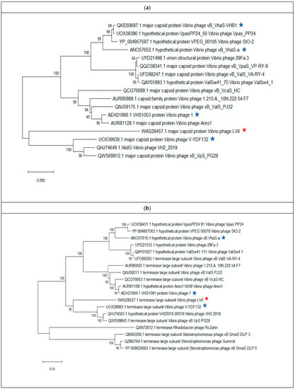 - Letchumanan, V.; Chan, K.G.; Pusparajah, P.; Saokaew, S.; Duangjai, A.; Goh, B.H.; Mutalib, N.S.; Lee, L.H. Insights into Bacteriophage Application in Controlling Vibrio Species. Front. Microbiol. 2016, 7, 1114. [Google Scholar] [CrossRef] [PubMed]