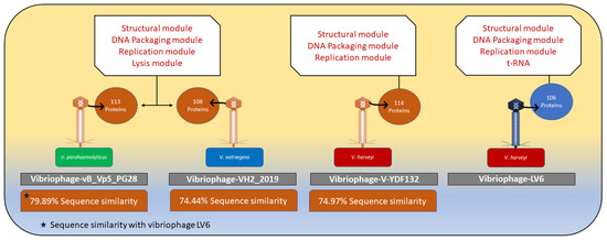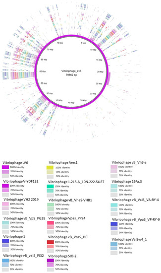 | Vibriophage-ϕLV6 | Siphophage-VHS1 | Vibriophage-vB_VhaM_pir03 | Vibriophage-VB_VhaS_PcB-1G | Vibriophage-VB_VcaS_HC | Vibriophage-Virtus | |