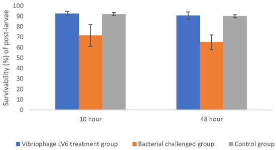 2.9. In Vivo Challenge Studies to Assess the Ability of Vibriophage-ϕLV6 to Inhibit the Growth of Luminescent V. harveyi in P. vannamei Shrimp Post-Larvae Tanks