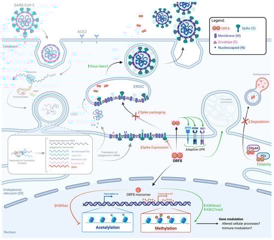 Modulation of cellular pathways promoting viral replication by SARS-CoV-2 ORF8. Replication cycle of SARS-CoV-2 is illustrated from virus entry, viral RNA replication, and assembly, to virus particle release. Viral and cellular events known to be modulated by ORF8 include ER stress responses, histone post-translation modifications, and spike expression. Reduced spike expression by ORF8 is represented as dimmed spike protein. Processes modulated by ORF8 are highlighted in high contrast, while steps of the SARS-CoV-2 life cycle unaffected by ORF8 (entry, replication, and translation) have been dimmed. M, Membrane; E, Envelope; N, Nucleocapsid; ER, Endoplasmic reticulum; ERGIC, ER intermediate compartment. Created in BioRender.com, accessed on 9 March 2023.